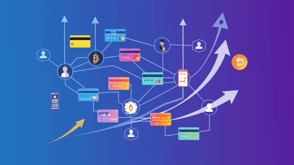 ภาพประกอบเครือข่ายระดับโลกที่มีไอคอนบัตรและการชำระเงินดิจิทัลเชื่อมต่อผู้คนและธุรกิจ แสดงการเติบโต