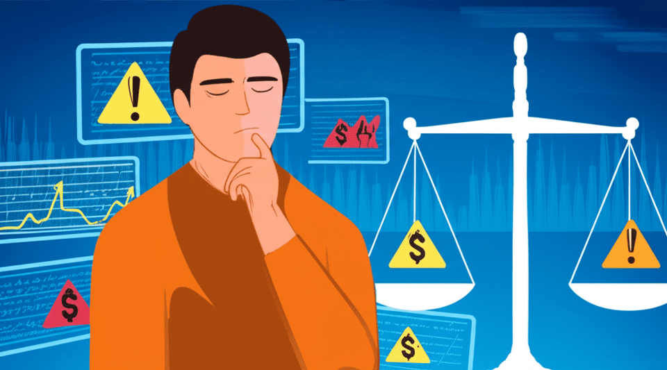 ภาพประกอบของนักลงทุนที่จัดการกราฟการเงินหลายแผ่นอย่างสงบ ด้วยสัญลักษณ์กำไรและความเสี่ยง รวมถึงตาชั่งสมดุลในพื้นหลังตลาดที่คึกคัก