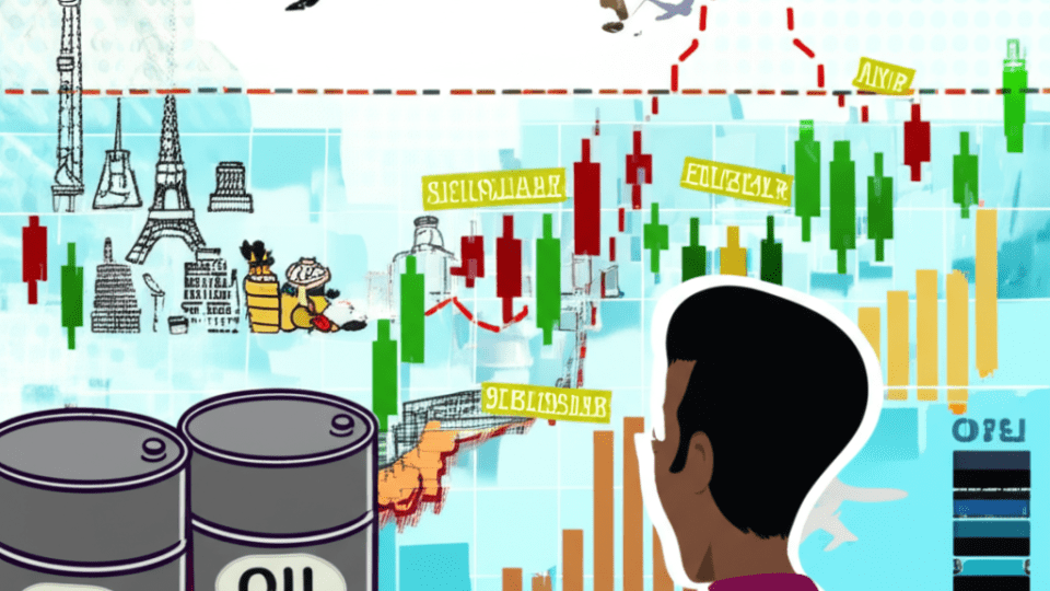 ภาพประกอบคนกำลังดูกราฟการผันผวนของค่าเงิน พร้อมพื้นหลังสถานที่ท่องเที่ยว ถังน้ำมัน และสินค้าอาหาร