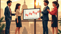 ภาพประกอบสไตล์พิกเซลอาร์ตของกราฟตลาดหุ้นที่เติบโต พร้อมองค์ประกอบเทคโนโลยี สื่อถึงโอกาสการลงทุนในอุตสาหกรรมเทคโนโลยีอย่าง Broadcom
